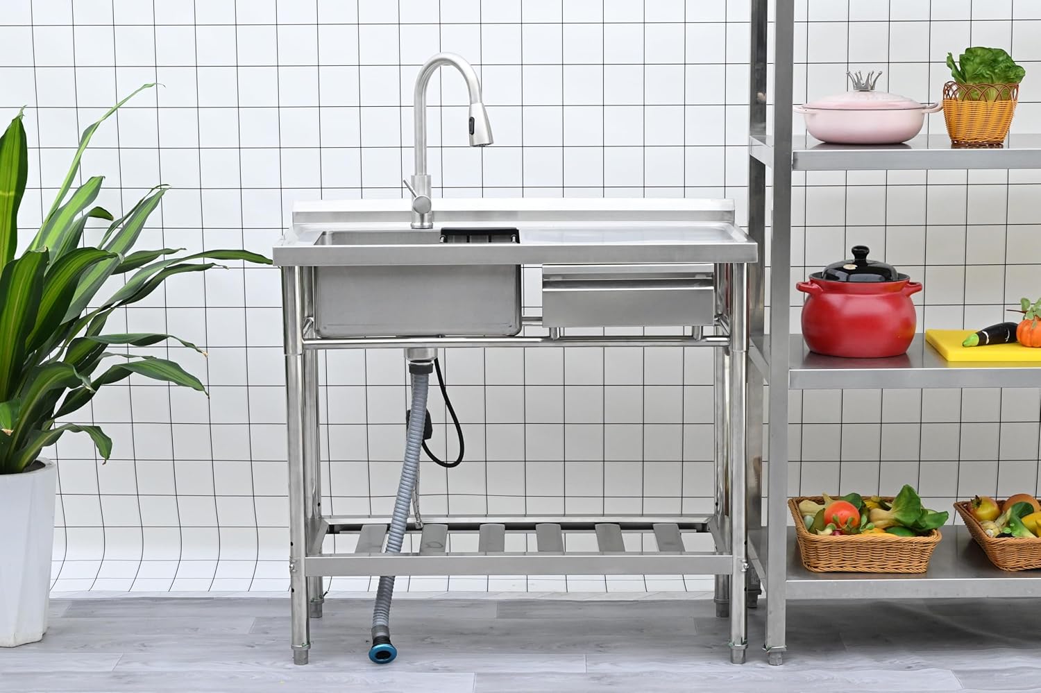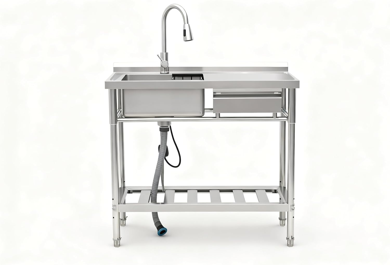 Transform your commercial kitchen with this professional-grade 39-inch stainless steel sink station. This free-standing unit combines functionality and durability with its comprehensive design features. The station includes a premium pull-down faucet for superior water control and cleaning flexibility. The integrated storage rack maximizes workspace efficiency, while the convenient drawer provides quick access to essential items. The sink's commercial-grade stainless steel construction ensures long-lasting performance in busy kitchen environments. The thoughtfully designed storage solution includes a lower shelf rack, perfect for organizing supplies and equipment. This all-in-one station optimizes your kitchen workflow with its practical layout and robust construction. The spacious sink area accommodates large pots and pans, while the professional-style faucet offers both power and precision for various cleaning tasks. Perfect for restaurants, catering facilities, or any commercial kitchen setting where durability and efficiency are paramount. Installation is straightforward with the free-standing design, making it an ideal choice for kitchen upgrades or new installations.