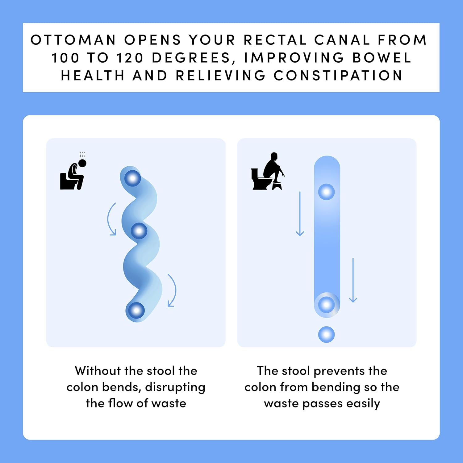 The TUSHY Ottoman toilet stool opens your rectal canal from 100 to 120 degrees, improving your bowel health and relieving constipation.